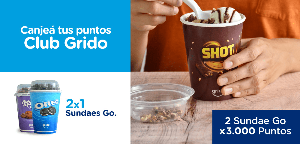 Promoción exclusiva para socios Club Grido. Canjeando 3000 puntos Club Grido te llevas un Sundae Go Shot + otro Sundae de regalo (sabor a elección). Promoción válida todos los días desde el 04/05/2023 al 31/05/2023 y/o hasta agotar stock. Válida en todas las heladerías adheridas a Club Grido. No suma puntos a socios Club Grido. No acumulable ni combinable con otras promociones vigentes. Válida para delivery/e-commerce. Imágenes a modo ilustrativo. Producto de origen nacional, elaborado por HELACOR S.A, Estomba s/n lote 20, Córdoba. CUIT 30-70796584-9.