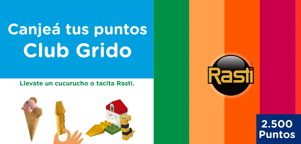 Promoción exclusiva para socios Club Grido. Canjeando 2.500 puntos Club Grido te llevas un Cucurucho Rasti. Incluye cucurucho o tacita de dos bochas. Promoción válida todos los días desde el 16/01/2023 hasta el 31/01/2023 y/o hasta agotar stock. Válida en todas las heladerías adheridas a Club Grido de la República Argentina. No suma puntos a socios Club Grido. No acumulable ni combinable con otras promociones vigentes. No válida para delivery. Imágenes a modo ilustrativo. Producto de origen nacional, elaborado por HELACOR S.A, Estomba s/n lote 20, Córdoba. CUIT 30-70796584-9.