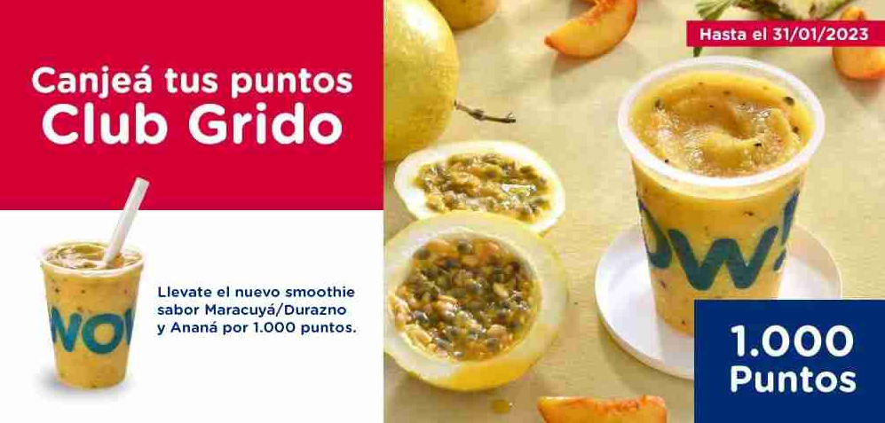 Promoción exclusiva para socios Club Grido. Canjeando 1000 puntos Club Grido te llevas un Smoothie sabor Maracuyá-Durazno Y Ananá Promoción válida todos los días desde el 07/01/2023 hasta el 31/01/2023 y/o hasta agotar stock. Válida en todas las heladerías adheridas a Club Grido de la República Argentina. No suma puntos a socios Club Grido. No acumulable ni combinable con otras promociones vigentes. No válida para delivery. Imágenes a modo ilustrativo. Producto de origen nacional, elaborado por HELACOR S.A, Estomba s/n lote 20, Córdoba. CUIT 30-70796584-9.
