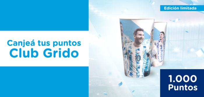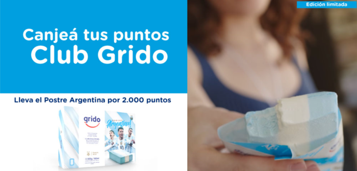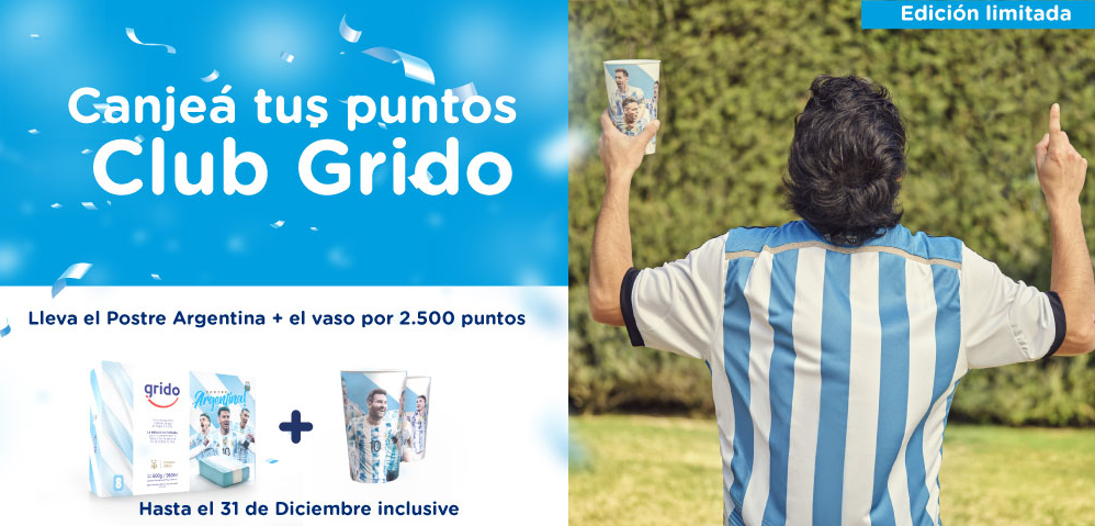 Promoción exclusiva para socios Club Grido. Canjeando 2.000 puntos Club Grido te llevas un Postre Argentina. Promoción válida todos los días desde desde el 16/12/2022 hasta el 31/12/2022 y/o hasta agotar stock, es edición limitada. Válida en todas las heladerías adheridas a Club Grido de la República Argentina. No suma puntos a socios Club Grido. No acumulable ni combinable con otras promociones vigentes. No válida para delivery. Imágenes a modo ilustrativo. Producto de origen nacional, licencia oficial AFA.