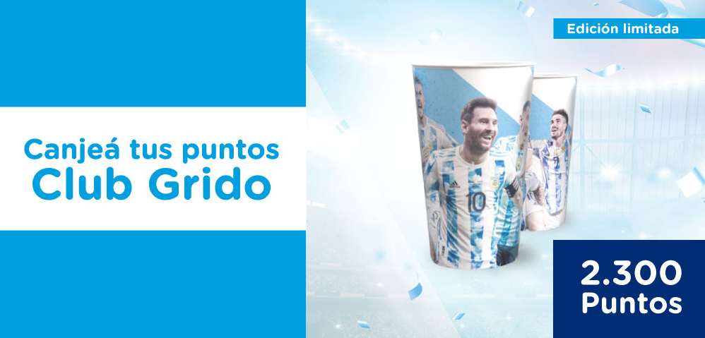 Promoción exclusiva para socios Club Grido. Canjeando 2.300 puntos Club Grido te llevas un Vaso AFA. Promoción válida todos los días desde el 04/11/2022 y/o hasta agotar stock, es edición limitada. Válida en todas las heladerías adheridas a Club Grido de la República Argentina. No suma puntos a socios Club Grido. No acumulable ni combinable con otras promociones vigentes. No válida para delivery. Imágenes a modo ilustrativo. Producto de origen nacional, licencia oficial AFA.