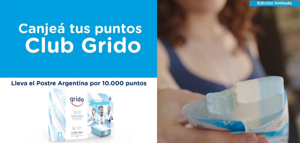 Promoción exclusiva para socios Club Grido. Canjeando 10.000 puntos Club Grido te llevas un Postre Argentina. Promoción válida todos los días desde el 04/11/2022 y/o hasta agotar stock, es edición limitada. Válida en todas las heladerías adheridas a Club Grido de la República Argentina. No suma puntos a socios Club Grido. No acumulable ni combinable con otras promociones vigentes. No válida para delivery. Imágenes a modo ilustrativo. Producto de origen nacional, licencia oficial AFA.