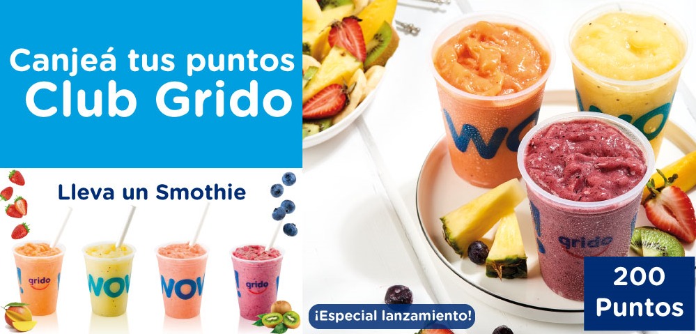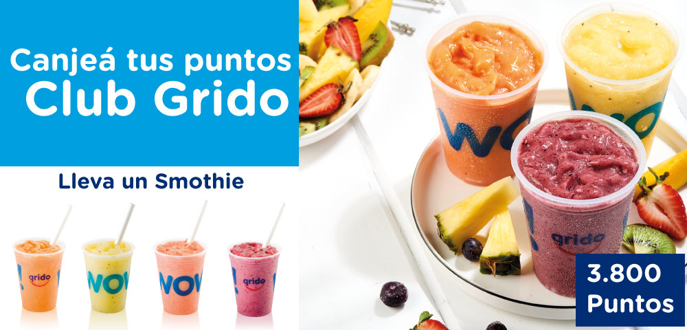 Promoción exclusiva para socios Club Grido. Canjeando 3800 puntos Club Grido te llevas un Smoothie sabor a elección por unidad. Promoción válida todos los días desde el 01/09/2022 al 15/12/2025 y/o hasta agotar stock. Válida en todas las heladerías adheridas a Club Grido de la República Argentina. No suma puntos a socios Club Grido. No acumulable ni combinable con otras promociones vigentes. No válida para delivery. Imágenes a modo ilustrativo. Producto de origen nacional, elaborado por HELACOR S.A, Estomba s/n lote 20, Córdoba. CUIT 30-70796584-9.