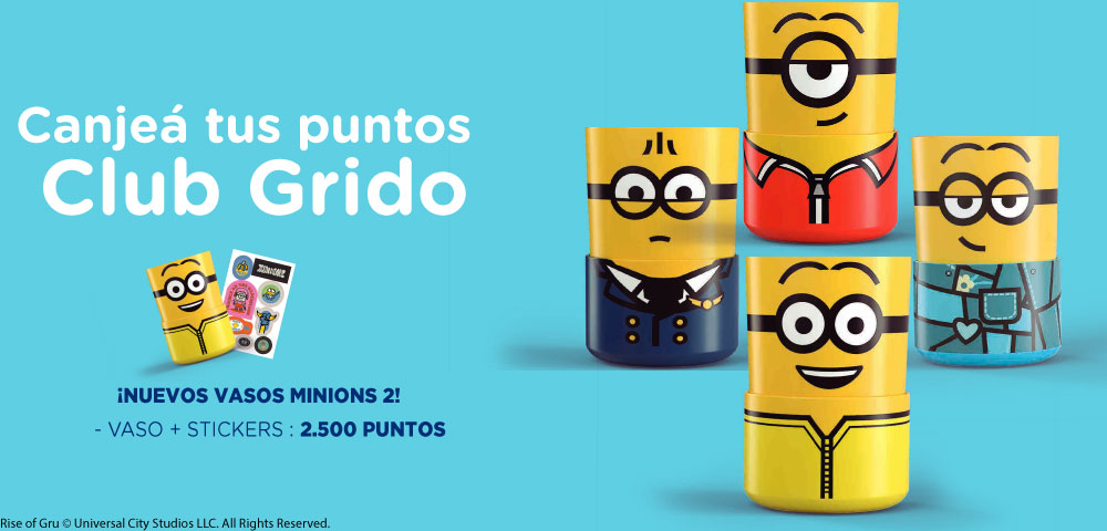 Promoción exclusiva para socios Club Grido, canjeando 2.500 puntos Club Grido te llevas un vaso Minions sin helado. Promoción válida todos los días desde el 27/07/2022 hasta agotar stock. Válida en todas las heladerías adheridas a Club Grido de la República Argentina. Sujeto a stock propio del local. Válida en todas las heladerías adheridas a Club Grido de la República Argentina. No suma puntos a socios Club Grido. No acumulable ni combinable con otras promociones vigentes. No válida para Delivery. Imágenes a modo ilustrativo. Producto de origen nacional, elaborado por Zott Producciones SA.