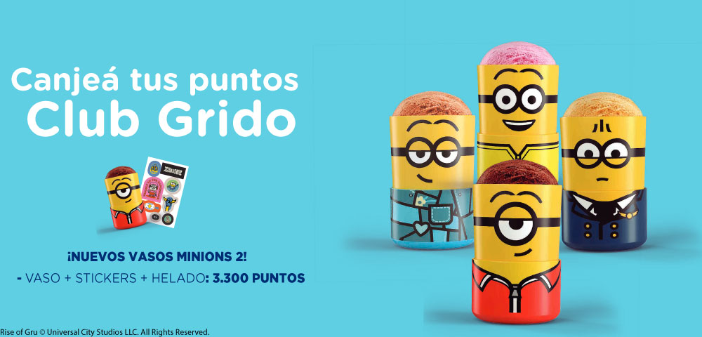 Promoción exclusiva para socios Club Grido, canjeando 3.300 puntos Club Grido te llevas un vaso Minions con helado. Promoción válida todos los días desde el 27/07/2022 hasta agotar stock. Válida en todas las heladerías adheridas a Club Grido de la República Argentina. Sujeto a stock propio del local. Válida en todas las heladerías adheridas a Club Grido de la República Argentina. No suma puntos a socios Club Grido. No acumulable ni combinable con otras promociones vigentes. No válida para Delivery. Imágenes a modo ilustrativo. Producto de origen nacional, elaborado por Zott Producciones SA.