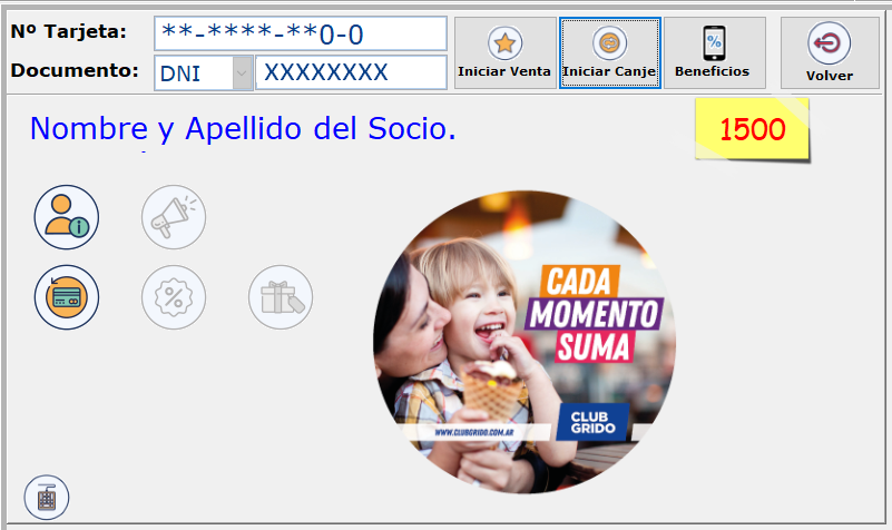 Recuerde que el Canje solo se verá disponible en el panel de ventas, al cargar una Tarjeta Club Grido a través de la Lectora de Códigos de Barra y debe ingresar el DNI de un Socio que cuente con puntos disponibles para acceder a dicho Canje.