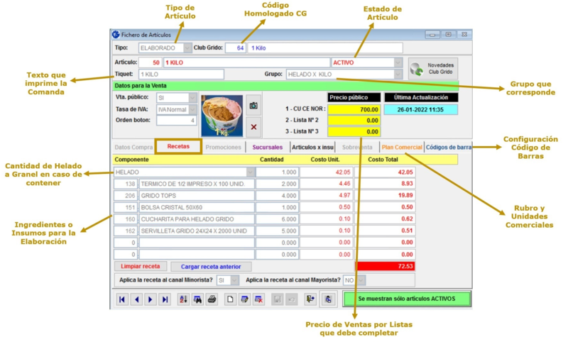 Dentro del Fichero de Artículos, ubique la Pestaña Receta y complete con la siguiente información: