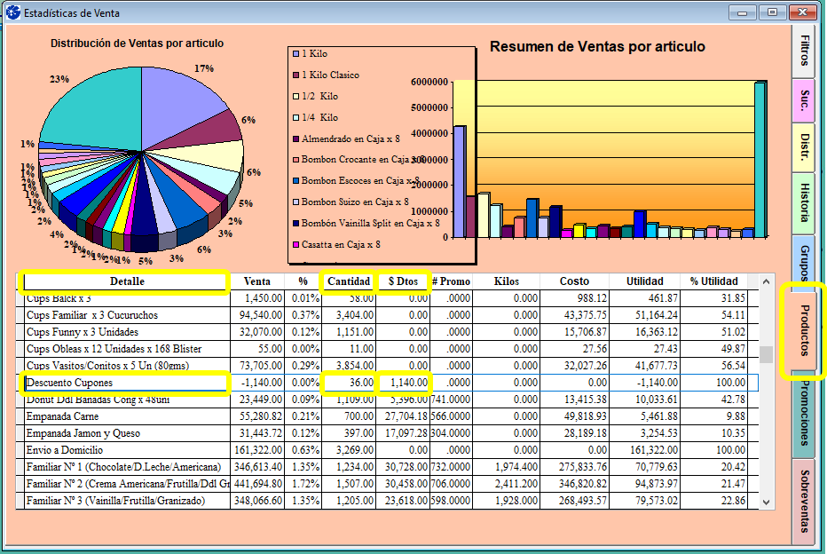 Para consultar los cupones puede dirigirse la Estadística de Ventas, aplicar los filtros deseados y observará en la pestana "Productos" la cantidad de Cupones redimidos y el importe total descontado, tal cual indica la imagen.