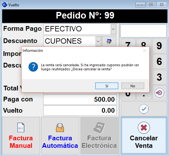 Si finaliza con la venta, seleccionando la opción de facturación correspondiente y luego anula la misma realizando una nota de crédito, los cupones incluidos en esta venta ya no podrán ser utilizados por el cliente.