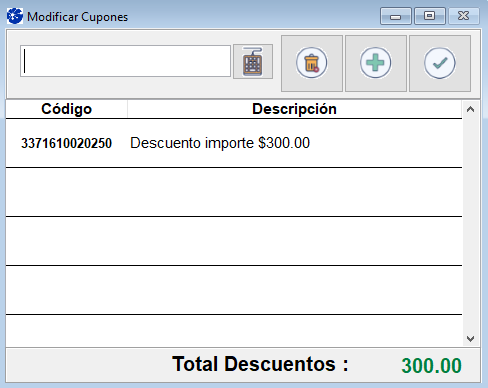 Realice clic en el icono "agregar un cupón" para que se liste debajo. Al final del la grilla en el campo "total descuentos" se informa el monto total de descuentos a aplicar.