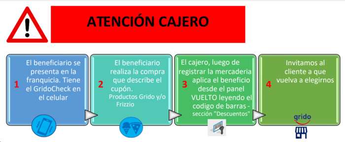 El beneficiario se presenta en la franquicia, menciona que posee un beneficio, exhibe desde su celular el cupón al Cajero, realiza la compra que el cupón indica mientras el cajero va cargando la misma.