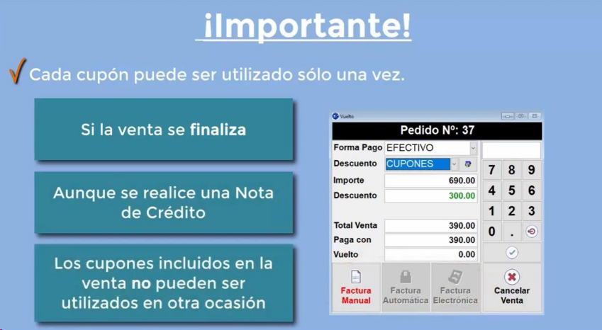 Los BENEFICIOS de cupones Virtuales se ingresan en el panel de VUELTO, en la opción CUPONES.